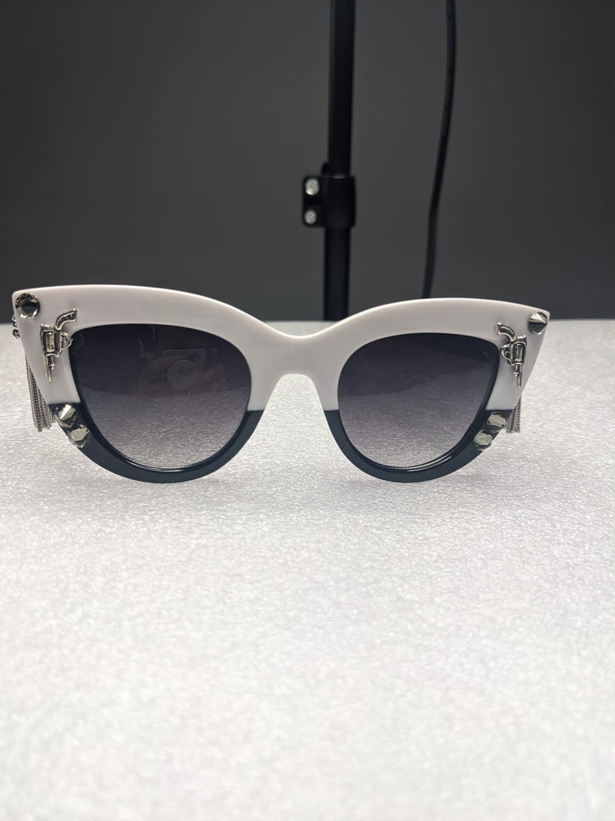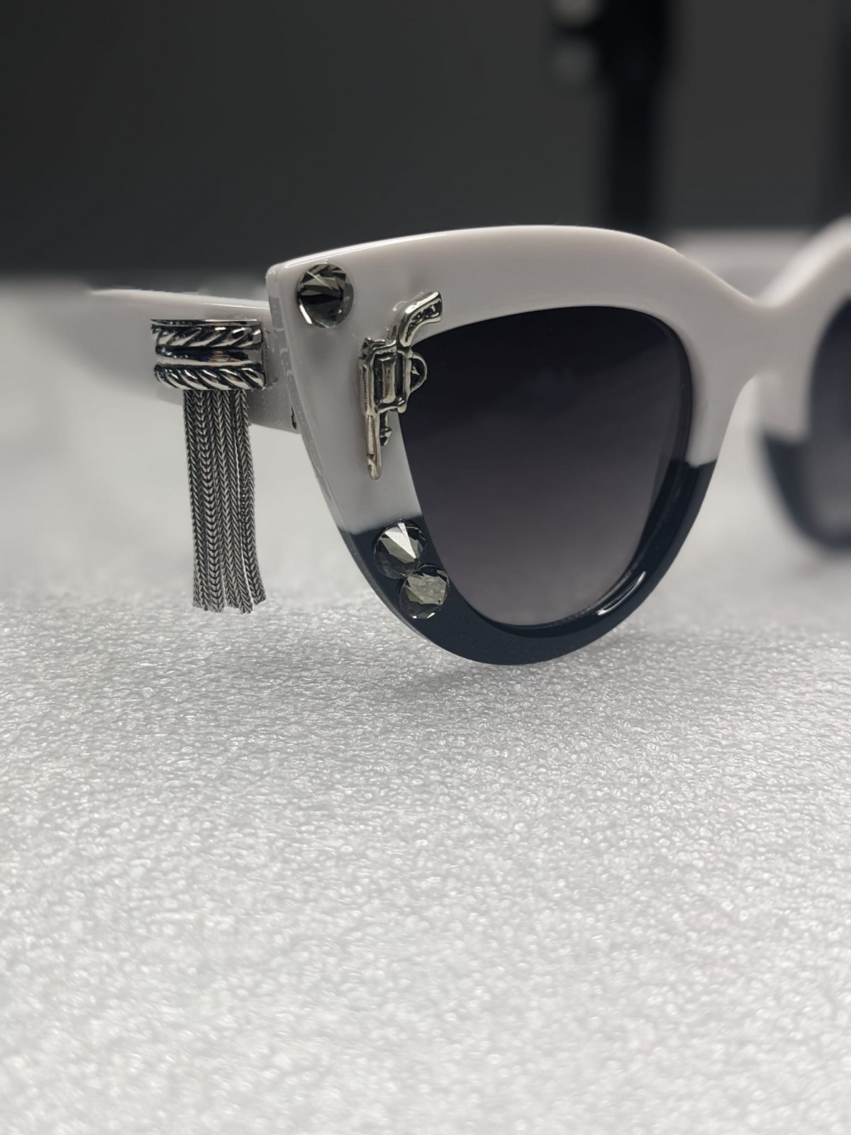 This custom pair is made using pointed black and white frames. I used vintage tassels, crystals and sterling silver guns for customization.